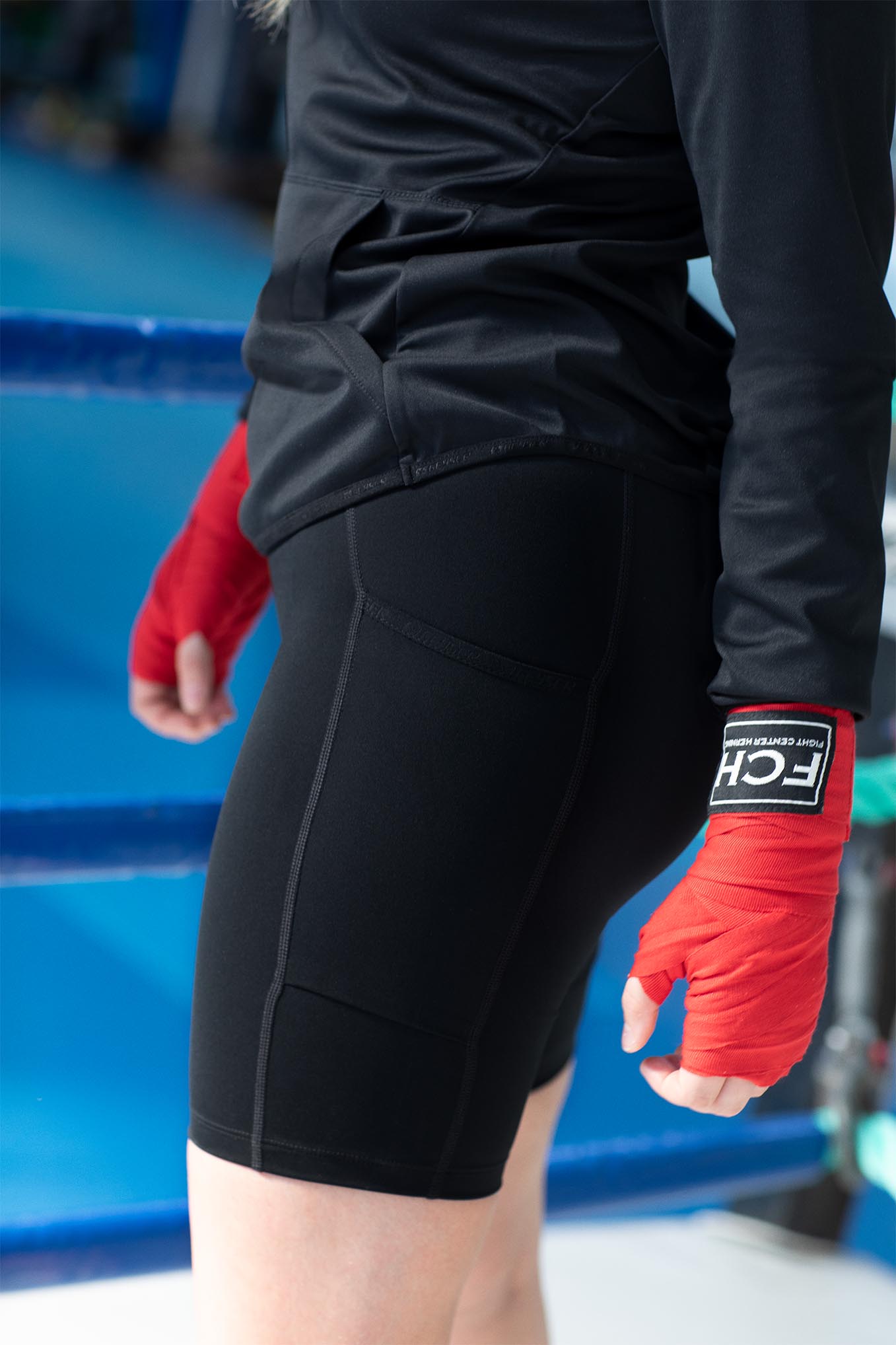 Krátké legíny z měkké funkční interlokové tkaniny s plochými švy. Materiál poskytuje zvýšenou elasticitu a vynikající volnost pohybu. Vysoký pas s měkkou gumou, která zajišťuje vysokou úroveň pohodlí během aktivity. Boční kapsy na nohavicích.